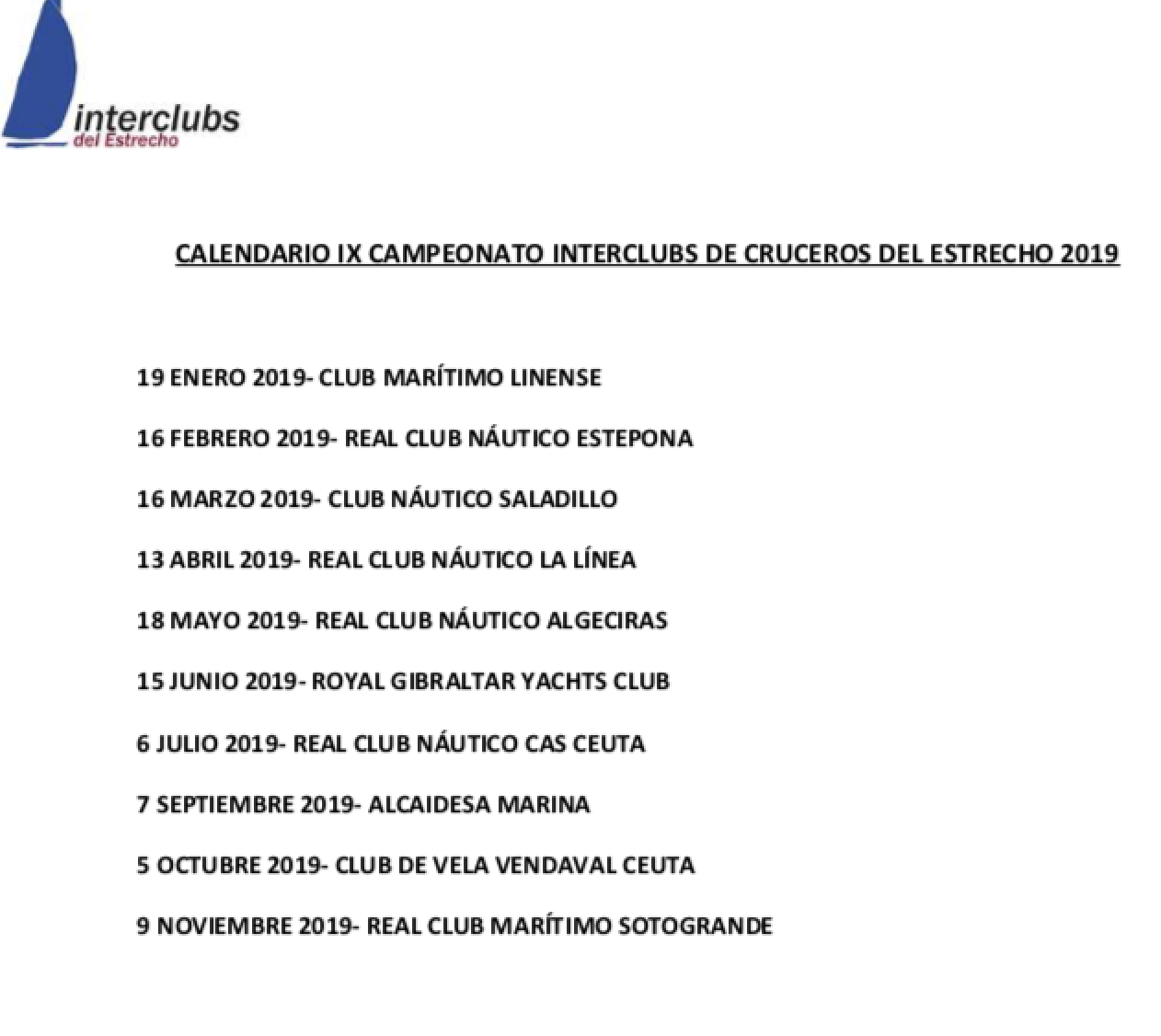 Este sábado 19 de enero comienza el IX Campeonato Interclubs del Estrecho, como siempre, con la inestimable colaboración de La Siesta Creativa, Buceosaco.com y Autoridad Portuaria Bahía de Algeciras. El Club Marítimo Linense será el encargado de abrir esta nueva temporada.